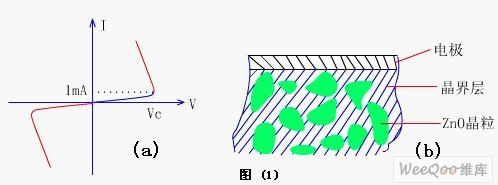 ZnO壓敏電阻實(shí)際上是一種伏安特性呈非線性的敏感元件,在正常電壓條件下,這相當(dāng)于一只小電容器,而當(dāng)電路出現(xiàn)過(guò)電壓時(shí),它的內(nèi)阻急劇下降并迅速導(dǎo)通,其工作電流增加幾個(gè)數(shù)量級(jí),從而有效地保護(hù)了電路中的其它元器件不致過(guò)壓而損壞,它的伏安特性是對(duì)稱(chēng)的,如圖(1)a 所示。這種元件是利用陶瓷工藝制成的,它的內(nèi)部微觀結(jié)構(gòu)如圖(1)b 所示。微觀結(jié)構(gòu)中包括氧化鋅晶粒以及晶粒周?chē)木Ы鐚?。氧化鋅晶粒的電阻率很低,而晶界層的電阻率卻很高,相接觸的兩個(gè)晶粒之間形成了一個(gè)相當(dāng)于齊納二極管的勢(shì)壘,這就是一壓敏電阻單元,每個(gè)單元擊穿電壓大約為3.5V,如果將許多的這種單元加以串聯(lián)和并聯(lián)就構(gòu)成了壓敏電阻的基體。串聯(lián)的單元越多,其擊穿電壓就超高,基片的橫截面積越大,其通流容量也越大。壓敏電阻在工作時(shí),每個(gè)壓敏電阻單元都在承受浪涌電能量,而不象齊納二極管那樣只是結(jié)區(qū)承受電功率,這就是壓敏電阻為什么比齊納二極管能承受大得多的電能量的原因。