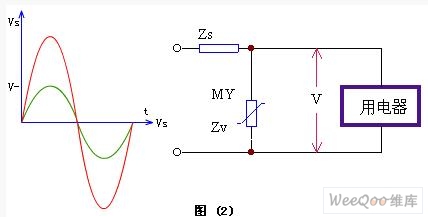 壓敏電阻在電路中通常并接在被保護(hù)電器的輸入端,如圖(2)所示。