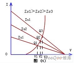 壓敏電阻的Zv與電路總阻抗(包括浪涌源阻抗Zs)構(gòu)成分壓器,因此壓敏電阻的限制電壓為V=VsZv/(Zs+Zv)。Zv的阻值可以從正常時(shí)的兆歐級(jí)降到幾歐,甚至小于1Ω。由此可見(jiàn)Zv在瞬間流過(guò)很大的電流,過(guò)電壓大部分降落在Zs上,而用電器的輸入電壓比較穩(wěn)定,因而能起到的保護(hù)作用。圖(3)所示特性曲線可以說(shuō)明其保護(hù)原理。直線段是總阻抗Zs,曲線是壓敏電阻的特性曲線,兩者相交于點(diǎn)Q,即保護(hù)工作點(diǎn),對(duì)應(yīng)的限制電壓為V,它是使用了壓敏電阻后加在用電器上的工作電壓。Vs為浪涌電壓,它已超過(guò)了用電器的耐壓值VL,加上壓敏電阻后,用電器的工作電壓V小于耐壓值VL,從而有效地保護(hù)了用電器。不同的線路阻抗具有不同的保護(hù)特性,從保護(hù)效果來(lái)看,Zs越大,其保護(hù)效果就越好,若Zs=0,即電路阻抗為零,壓敏電阻就不起保護(hù)作用了。圖(4)所描述的曲線可以說(shuō)明Zs與保護(hù)特性之間的關(guān)系。