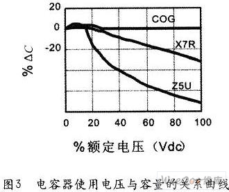 ①電容器的使用電壓對(duì)電容器的電容量有影響,穩(wěn)定性低的介質(zhì),在施加額定工作電壓后容量會(huì)大幅度下降(見(jiàn)圖3),以至達(dá)不到使用效果,這一點(diǎn)在選擇電容器時(shí)必須給以充分注意(不能一味追求大容量和小體積,必須在容量和使用電壓上留有充分余地)。