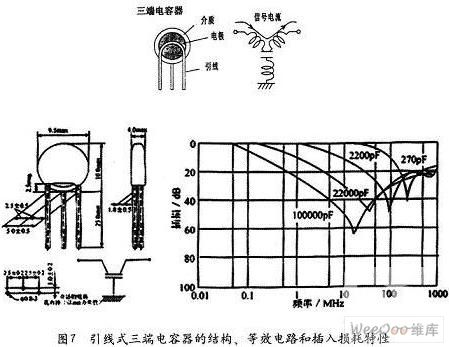 2)片式三端電容器 我們平常使用的陶瓷圓片電容器作為旁路電容,可以將高頻干擾短路到地,達(dá)到抗干擾的目的。但是電容器的引線電感及電容內(nèi)部的剩余電感卻限制了它的高頻特性發(fā)揮。圖6是普通電容器做高頻旁路時(shí)的引線電感影響例。