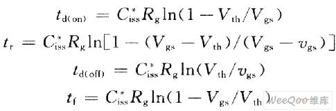 VDMOS的開啟延遲時間td(on)、上升時間tr、關(guān)斷延遲時間td(off)、下降時間tf的關(guān)系式可分別表達為:
