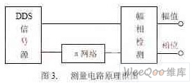 2.4 基于π網(wǎng)絡(luò)的靜電容測(cè)量方法 利用DDS(直接數(shù)字頻率合成)信號(hào)源作為激勵(lì)源,其輸出交流信號(hào)頻率遠(yuǎn)離石英晶體諧振頻率,該信號(hào)激勵(lì)接有被測(cè)石英晶體的π網(wǎng)絡(luò)。此時(shí),石英晶體等效于一個(gè)值為C0的電容。π網(wǎng)絡(luò)的輸出電壓與該電容存在一定的函數(shù)關(guān)系,由于輸入電壓和π網(wǎng)絡(luò)的參數(shù)已知,測(cè)量輸出電壓并根據(jù)這一函數(shù)關(guān)系,可以計(jì)算出C0值。這種方法與測(cè)石英晶體諧振頻率的方法很相似,都需要利用DDS輸出信號(hào)作為激勵(lì)信號(hào)并檢測(cè)π網(wǎng)絡(luò)輸出的矢量電壓。兩者區(qū)別在于測(cè)量諧振頻率要求檢測(cè)輸入電壓和輸出電壓之間相位差,而測(cè)量靜電容則要求測(cè)量輸入電壓和輸出電壓的幅值。因此,對(duì)這兩個(gè)矢量電壓信號(hào)采用幅相檢測(cè)的辦法可以使測(cè)量石英晶體的諧振頻率和靜電容統(tǒng)一起來。