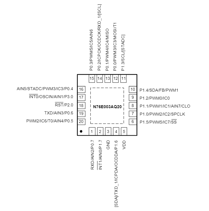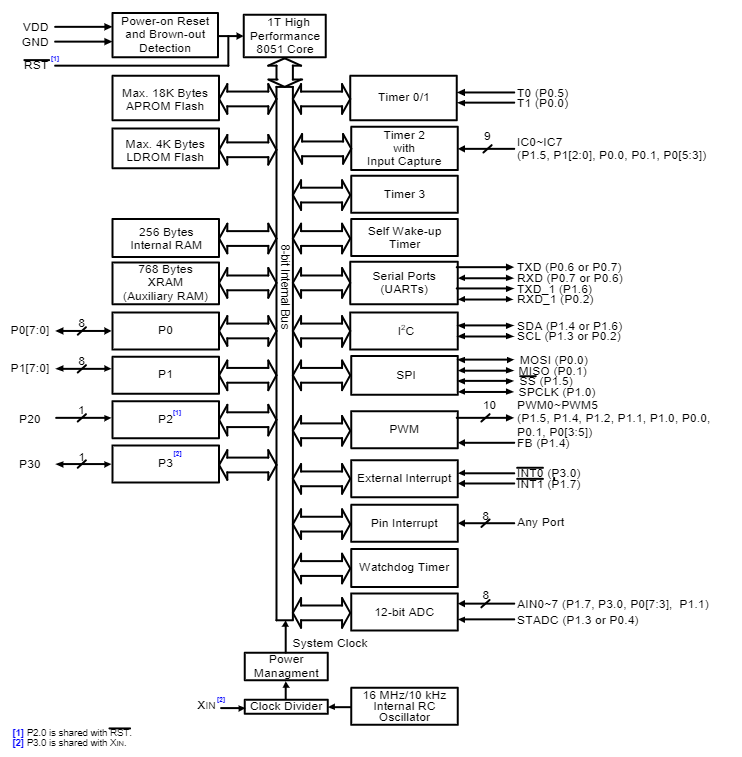 N76E003是一款嵌入式閃存型、8位高性能的基于1T 8051的微控制器。 其指令集與標(biāo)準(zhǔn)的80C51完全兼容,并且性能增強。N76E003包含一個高達18K字節(jié)的主Flash,稱為APROM,用戶代碼的內(nèi)容就在其中。 N76E003的Flash支持應(yīng)用內(nèi)編程(IAP)功能,可以進行片上固件更新。 IAP還可以將用戶代碼陣列的任何塊配置為非易失性數(shù)據(jù)存儲,由IAP寫入,由IAP或MOVC指令讀取。還有一個叫做LDROM的閃存,啟動代碼通常存放在其中,用于進行系統(tǒng)內(nèi)編程(ISP)。 LDROM的大小是可配置的,最大為4K字節(jié)。為了便于編程和驗證,閃存允許通過并行寫入器或在線編程(ICP)進行電子編程和讀取。一旦代碼被確認(rèn),用戶可以鎖定代碼以保證安全。N76E003提供豐富的外設(shè),包括256字節(jié)的SRAM,768字節(jié)的輔助RAM(XRAM),多達18個通用I/O,兩個16位定時器/計數(shù)器0/1,一個16位定時器2,帶有三通道輸入捕捉模塊,一個看門狗定時器(WDT),一個自喚醒定時器(WKT)、 一個用于通用或波特率發(fā)生器的16位自動重載定時器3,兩個帶幀錯誤檢測和自動地址識別的UART,一個SPI,一個I2C,五個增強型PWM輸出通道,所有I/O的八通道共享引腳中斷,以及一個12位ADC。 這些外設(shè)配備了18個具有4級優(yōu)先權(quán)的中斷能力的源。N76E003配備了三個時鐘源,并支持通過軟件進行即時切換。三個時鐘源包括外部時鐘輸入、10 kHz內(nèi)部振蕩器和一個16 MHz內(nèi)部精確振蕩器,該振蕩器在室溫下出廠時已修整到±1%。 N76E003提供額外的電源監(jiān)控檢測,如上電復(fù)位和4級斷電檢測,穩(wěn)定了上電/斷電順序,實現(xiàn)了高可靠性系統(tǒng)設(shè)計。N76E003微控制器的運行功耗非常低,有兩種經(jīng)濟的電源模式來降低功耗--空閑和斷電模式,這兩種模式可由軟件選擇??臻e模式關(guān)閉CPU時鐘,但允許繼續(xù)外設(shè)操作。掉電模式停止整個系統(tǒng)時鐘,以達到最小的功耗。N76E003的系統(tǒng)時鐘也可以通過軟件時鐘分頻器來減慢,這使得執(zhí)行性能和功耗之間有了靈活性。N76E003擁有高性能的CPU內(nèi)核和豐富的外設(shè),可以滿足一般用途、家電或電機控制系統(tǒng)的需求。