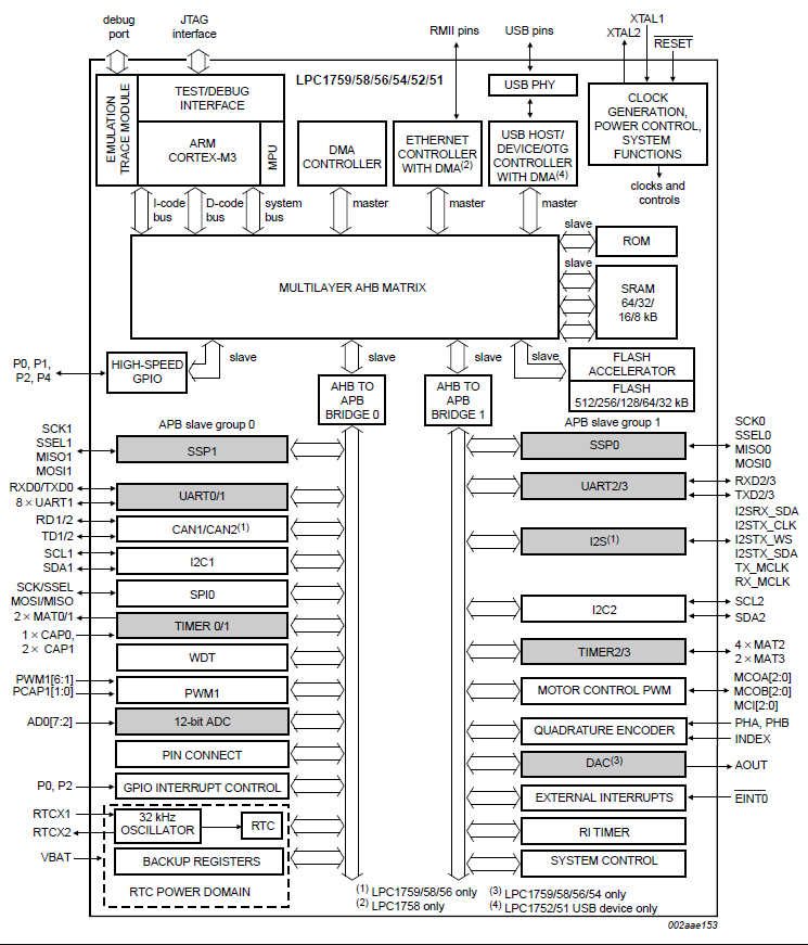 ?僅在LPC1758上,以太網(wǎng)MAC具有RMII接口和專用DMA控制器。?USB 2.0全速設(shè)備/主機(jī)/OTG控制器具有專用DMA控制器和片上PHY,用于設(shè)備、主機(jī)和OTG功能。LPC1752/51僅包括一個(gè)USB設(shè)備控制器。